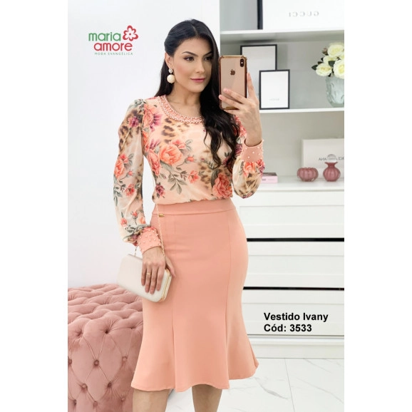 vestido evasê bordado manga longa, estampado, malha paris e tule. O vestido prático para qualquer ocasião!