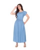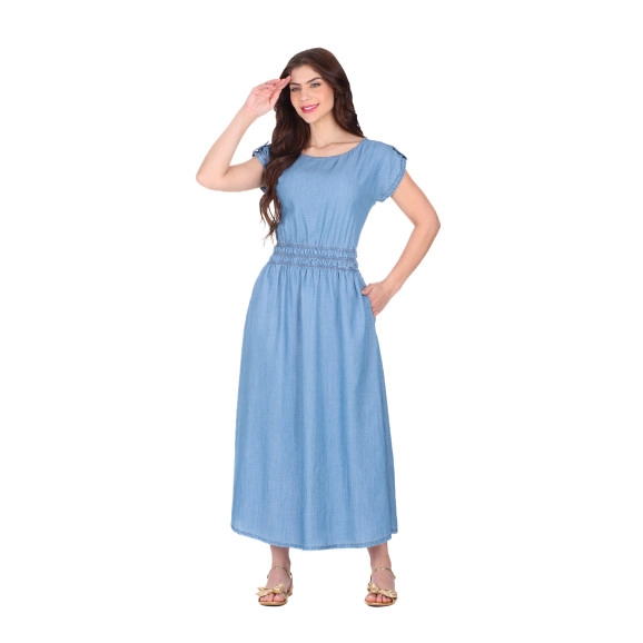 Vestido confeccionado em jeans, decote redondo, mangas sem cava com detalhe em martingale e botão, cintura com elástico interno, bolsos funcionais e não possui forro.