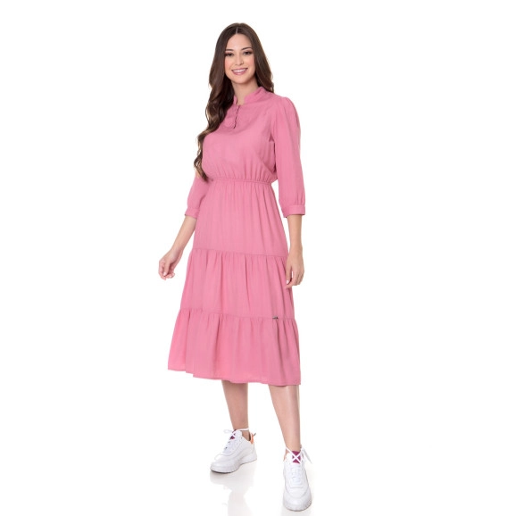 Vestido em visco linho, gola alta com abertura frontal e fechamento por botões na cor da peça, mangas ¾,elástico interno na cintura, saia com volume, recorte e franzido. Possui forro. Composição 55% viscose 45% poliéster