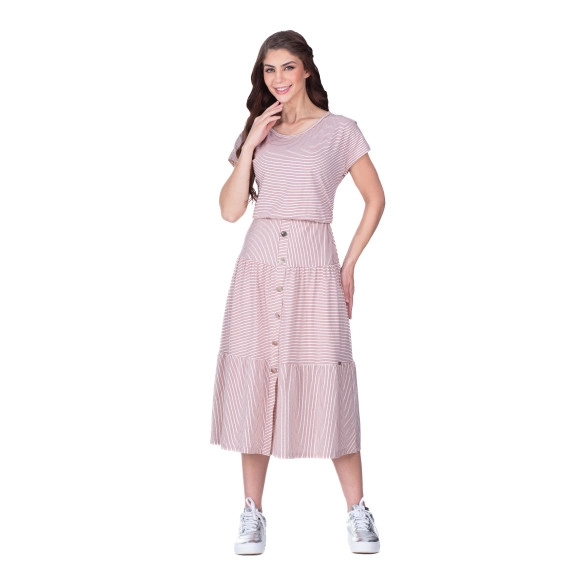 Vestido confeccionado em malha texturizada listrada, decote redondo, ombros com leve pregas, mangas sem cava, elástico interno na cintura, botões fixos, fenda frontal e possui forro. Composição: 58% algodão 36% poliester 6% linho forro 100% poliester