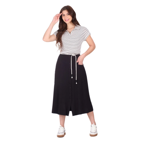 Vestido confeccionado moletinho e malha texturizada listrada, decote em v com gola, mangas sem cavas e com punho, revel com botões de pressão encapados, bolsos funcionais, acompanha cordão com ponteiras e possui forro.