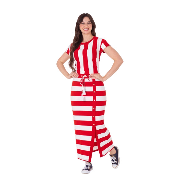 Vestido confeccionado em malha listrada, decote em ribana, ilhós e viés, botões de pressão fixos, fenda frontal e possui forro.