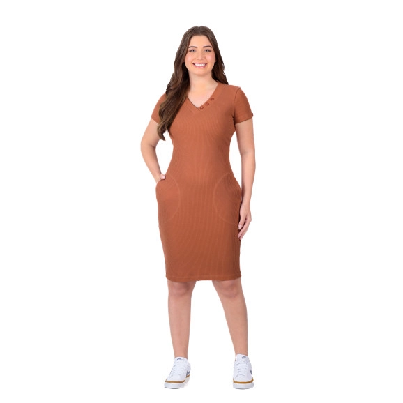 Vestido confeccionado em malha canelada, decote V com botões fixos, mangas curtas, bolsos funcionais e não possui forro.