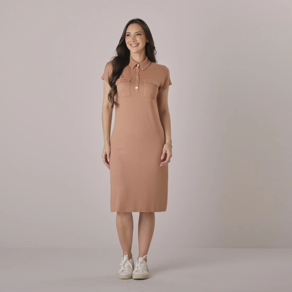 Vestido em malha, decote redondo, mangas curtas com cava raglan e elástico interno, cintura marcada por elástico interno, viés com ponteiras, bolsos funcionais e possui forro.