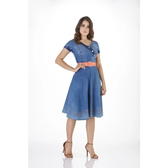 Detalhe: Vestido jeans modelo lady like transpassado possui detalhe em botões, fechamento em zíper atrás. Aquele vestido despojado e versátil, para você arrasar em qualquer evento que você for!