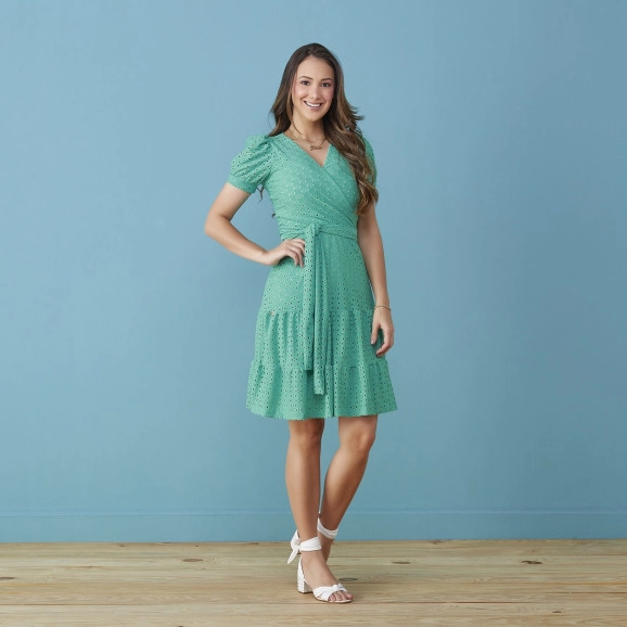 Vestido Laise Três Marias Verde Tatá Martello confeccionado na malha laise, traspassado, evasê, três Marias, forrado, manga curta, acompanha faixa de mesmo tecido. Composição: 96% Poliéster 4% Elastano