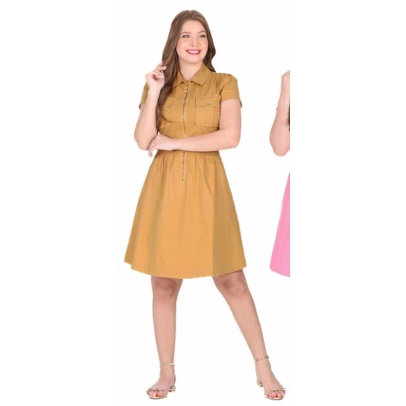 Vestido confeccionado em jeans color, decote com gola, fechamento frontal por zíper, mangas curtas, bolsos funcionais e não possui forro.