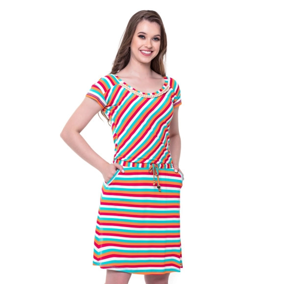 O vestido listrado com cordão laranja foi confeccionado em malha viscose possui detalhe na gola, amarração em cordão na cintura, bolsos laterias. Composição do tecido 96%viscose 4%elastano forro 100%poliester. Look bem despojado, fresquinho, ideal para você curtir a estação!