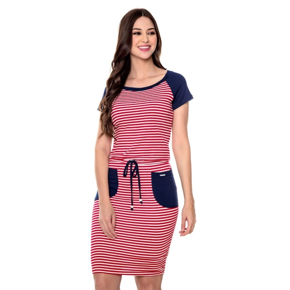 Vestido Listrado Vermelho Hapuk Vestido com composê de tecido listrado e liso, com canaleta e roletê funcional para ajustar cintura. Possui bolsos funcionais. Composição: 49% viscose- 49% poliéster- 2% elastano. Vestido super estiloso ideal para usar com tênis!