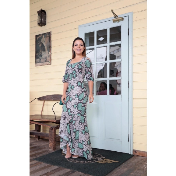 Detalhe: vestido longo confeccionado em tecido leve e fresquinho, dando leveza ao caminhar, possui elástico nas mangas, recorte diferenciado no barrado, fechamento em zíper atrás. Dress lindo e confortável para você curtir o final de semana!