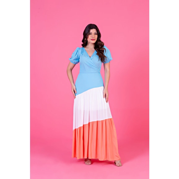 Com seus recortes bicolores, o Vestido Longo de Viscose Lisa da Hadaza destaca-se pela harmonia das cores e valoriza a silhueta feminina de forma única. O decote em V transpassado, os elásticos nas mangas bufantes e os franzidos nos ombros e recortes proporcionam um efeito visual encantador.