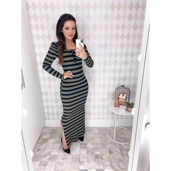 Vestido Longo Canelado Verde Boutique K, confeccionado em malha canelada, manga longa, listrado com detalhe em lurex, detalhe em botões, fenda nas laterais. Composição do tecido em 96%Viscose e 4%Elastano. Só quem tem um vestido longo, sabe o quanto é super versátil.