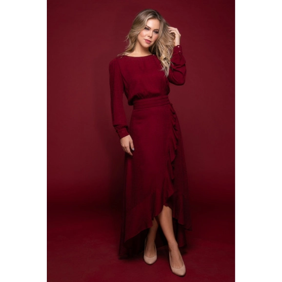 Vestido Longo com Babados Bordô Via Tolentino