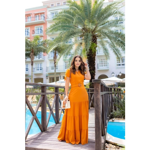 Detalhe: Vestido longo possui detalhe em botões na gola, detalhe em amarração nas mangas, fechamento em zíper lateral. Só quem tem um vestido longo, sabe o poder que ele traz ao look!