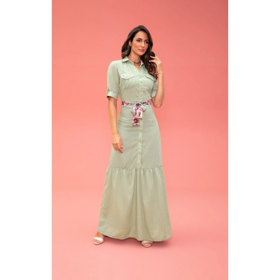 Vestido Longo com Faixa Fasciniu's, possui fechamento em botões, bolsos no busto, fechamento em zíper lateral, confeccionado em 80% Poliester 20% Algodão e Forro 100% Poliester. Acompanha faixa. Longo lindo e fluído, para você arrasar em qualquer ocasião!