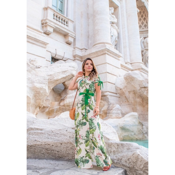Detalhe: Vestido confeccionado em viscose, possui detalhe em amarração nas mangas, fenda lateral. Longo divo, pode ser usado durante o dia ou a noite, fica lindo com salto, rasteiras, anabelas.