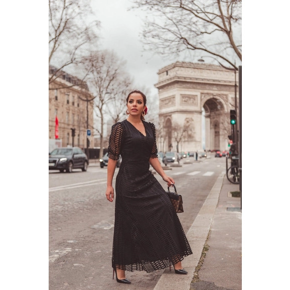 O Vestido longo transpassado preto joyaly tem as manga 3/4, fechamento em zíper lateral. A composição do tecido é vestido e forro 100%poliester. Vestido elegantérrimo, ideal para eventos formais!