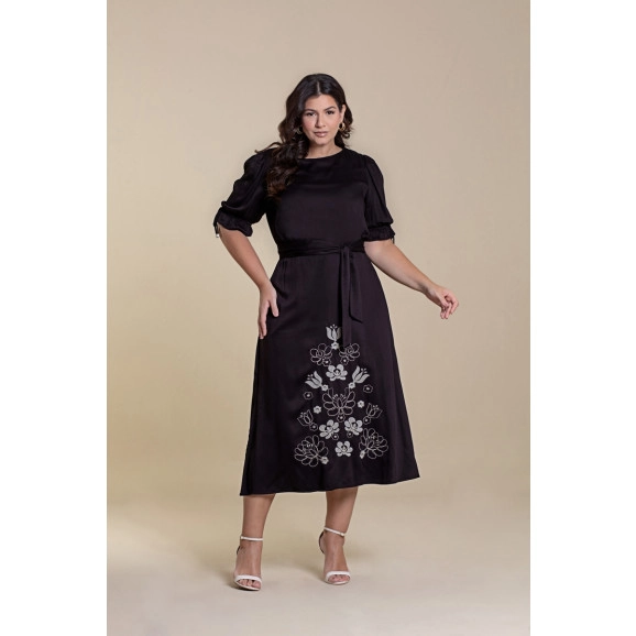 Vestido Longuete De Viscose Satin Com Bordado Florido Hadaza
