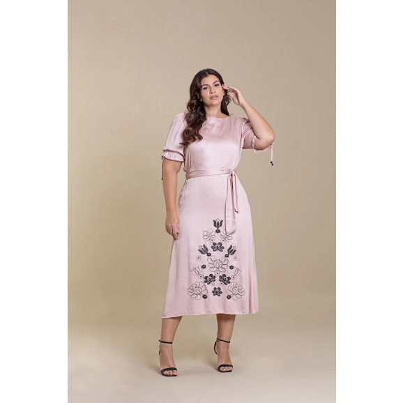 Vestido Longuete De Viscose Satin Com Bordado Florido Hadaza