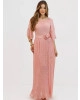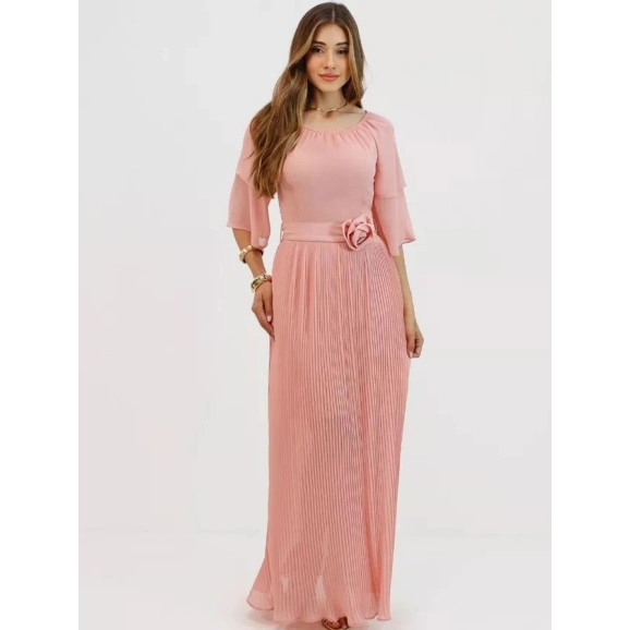 Vestido longo no crepe michelangelo com saia plissada, decote com elastico e manga com babados. Possui cinto de flor no mesmo tecido.