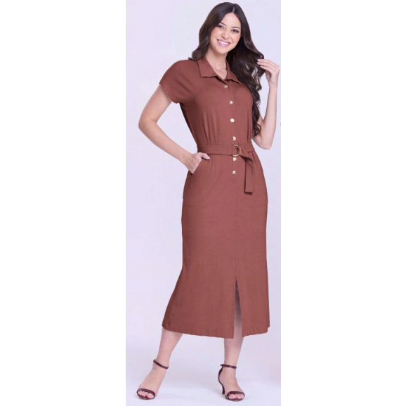 Vestido em moletinho leve, decote com gola, fechamento frontal por botões de pressão, mangas sem cava, elástico interno na cintura, bolsos funcionais, acompanha faixa e fivela de metal, fenda frontal e possui forro anagua.