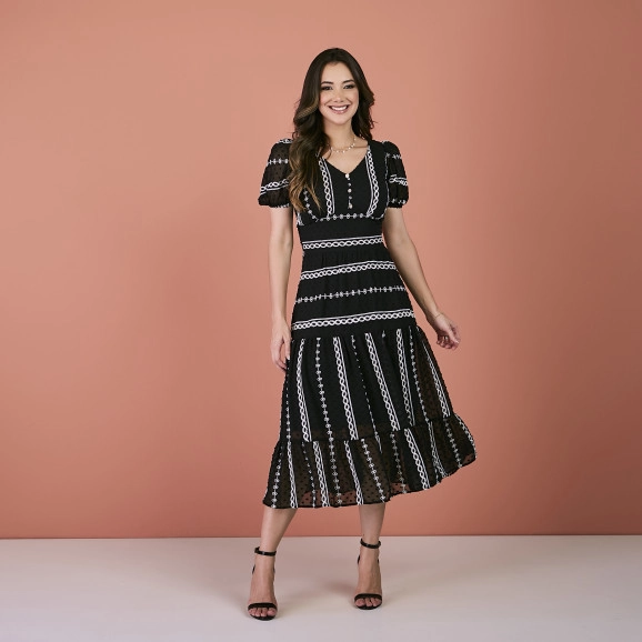 Vestido Macris Em Crepe Poá Bordado Preto Tata Martello