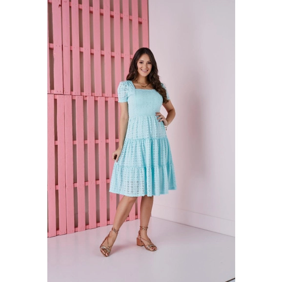 Detalhe: vestido confeccionado na malha laise, forrado, modelo evasê, manga curta, decote quadrado. Laise, tendência fortíssima nesse verão! Adquira já o seu!