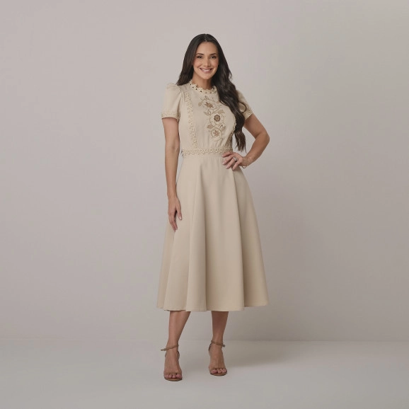 Vestido Mariane Em Alfaiataria Bordado Bege Tata Martello