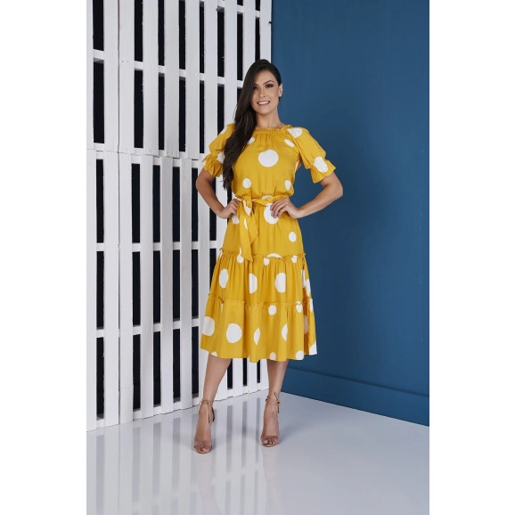 Produto: Vestido Midi com Faixa Poá Amarelo Tatá Martello