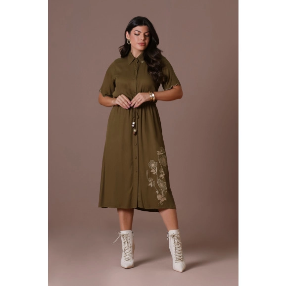 Vestido Midi De Viscose Com Bordados Florais Verde Hadaza