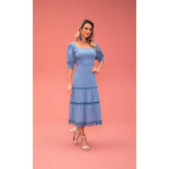 Vestido Midi Detalhe em Renda Azul Fasciniu's