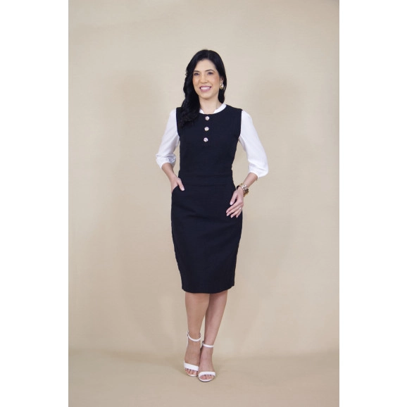 Vestido de comprimento midi confeccionado em tweed estruturado. Modelo sem mangas com decote redondo e fechamento posterior por zíper. O design é enriquecido com botões decorativos frontais e a praticidade de bolsos funcionais. Apresenta um corte de alfaiataria impecável que valoriza a silhueta com sofisticação e conforto. Acabamento de alto padrão da coleção Aurora.