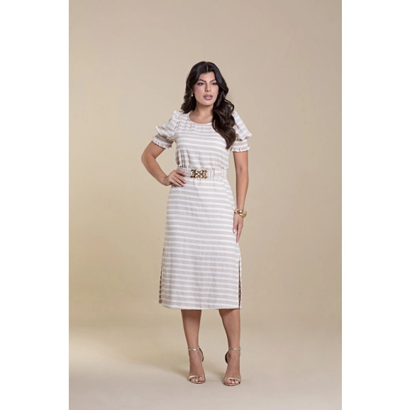 Vestido Midi Manga Curta De Linho Lurex Com Cinto Hadaza