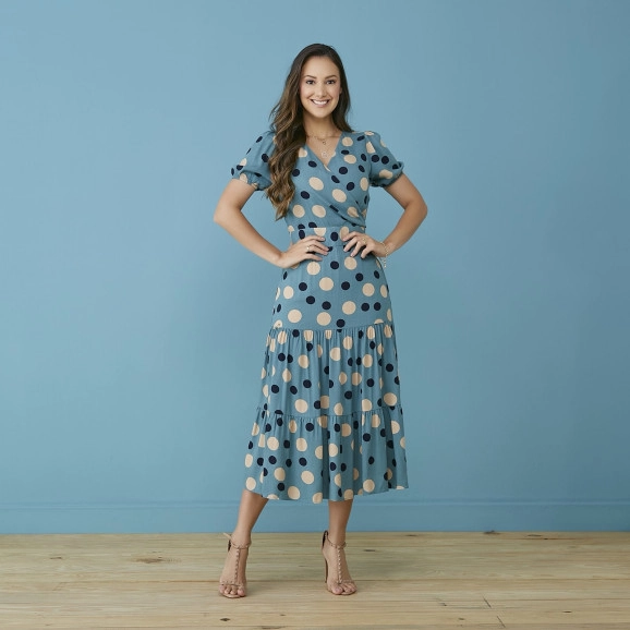 Vestido Midi Poá Verde Tatá Martello, confeccionado em viscose, forrado, estampa de poá, transpasse no busto, decote em "V", manga curta, saia com babados, lastex na cintura, cumprimento midi. Composição:100% Viscose