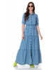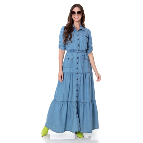 Vestido jeans com lavagem e amaciamento, gola, revel frontal funcional com botões personalizados, bolsos funcionais, mangas ¾ com martingale, lastex na cintura. Saia com recortes e franzidos. Não possui forro. Composição 61% algodão 37% poliéster 2% elastano