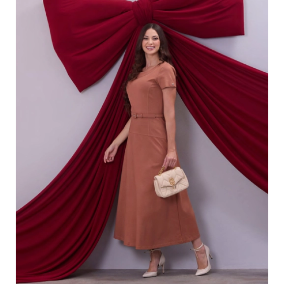 Vestido em ponto romana, decote redondo, mangas curtas, acompanha cinto encapado do próprio tecido e possui forro.