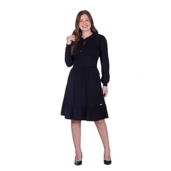 Vestido confeccionado em malha de algodão sustentável, decote com babados e fechamento em viés, mangas longas com franzido e punho em lastex, bolsos funcionais, elástico interno na cintura e possui forro.