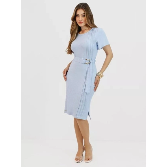 vestido de malha volare com decote redondo em víes, manga evasê e detalhe de nervura por toda a peça. Acompanha faixa com fivela dourada.