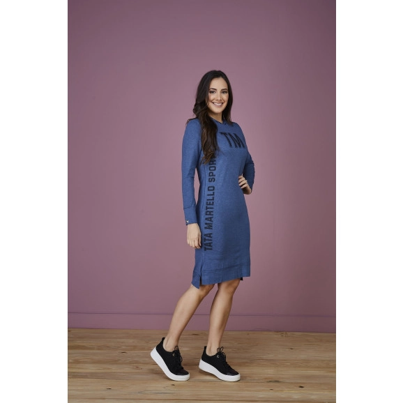 Vestido Moletinho Azul Tatá Martello, vestido com gorro, manga longa com punho, com escrita TM no peito. A composição 96 % Viscose 4 %elastano. Vestido estiloso, ideal para usar com tênis. Vestidos evangélicos mais despojados ou sofisticado, você encontra aqui! -