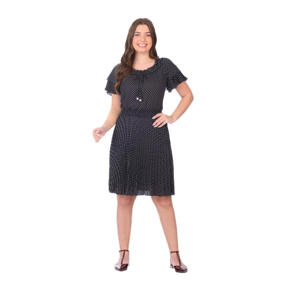 Vestido confeccionado em crepe estampado de poá, decote com elástico interno e babados, viés fixo com ponteiras, mangas com plissado, lastex na cintura, saia plissada e possui forro.