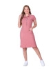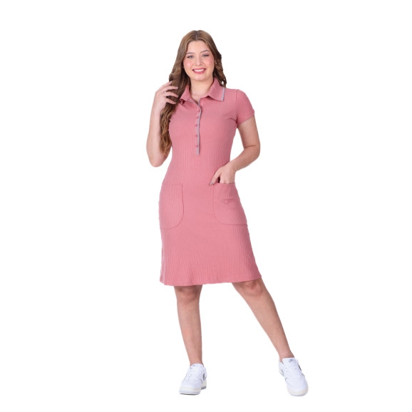 Vestido confeccionado em malha canelada, decote com gola ribana, fechamento frontal por botões, mangas curtas, bolsos funcionais e não possui forro.