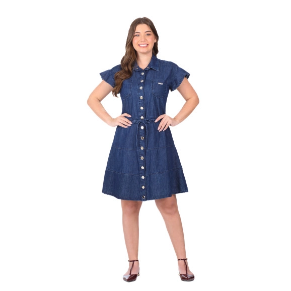 Vestido confeccionado em jeans leve, decote com gola, fechamento frontal por botão de pressão, bolsos funcionais, cintura com canaleta e faixa funcional.