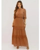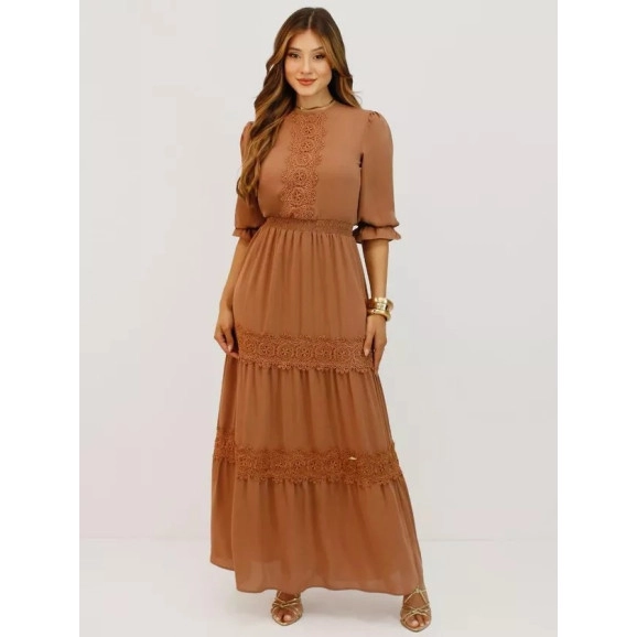 Vestido longo no tecido crepe new sabia, possui decote redondo, com manga 3/4 e lastex no punho. Todo o corpinho possui guipir sobreposto. Cós com lastex e guipir sobreposto entre as marias