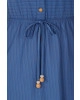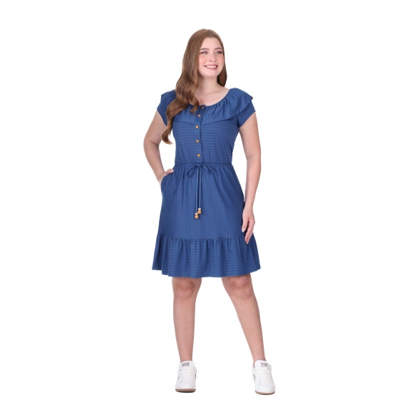 Vestido confeccionado em malha listrada, decotecom elástico interno e babado, fechamento frontalpor botões, cintura com elástico interno, detalheem viés fixo com ponteiras e bolsos funcionais.