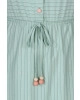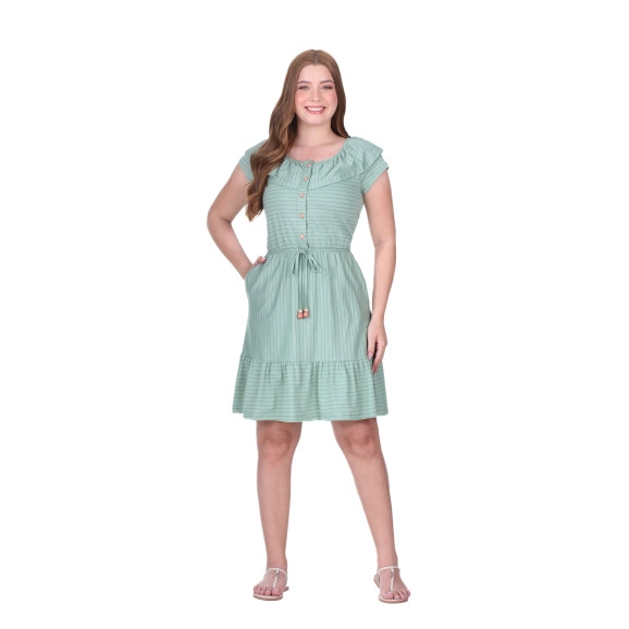Vestido confeccionado em malha listrada, decotecom elástico interno e babado, fechamento frontalpor botões, cintura com elástico interno, detalheem viés fixo com ponteiras e bolsos funcionais.