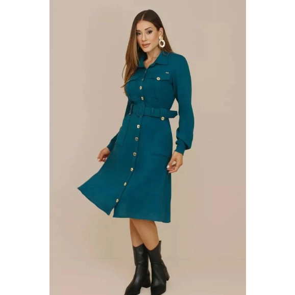 Vestido chemisie no comprimento do joelho em visco linho span, com mangas longas e fechamento frontal por botões. Possui bolsos utilitários e cinto encapado que valoriza a silhueta com elegância. Peça versátil e atemporal, ideal para composições sofisticadas no dia a dia.