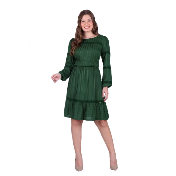 Vestido confeccionado em viscose maquinetada, detalhes em guippir, mangas longas com elástico interno na barra, cintura com elástico interno e possui forro.