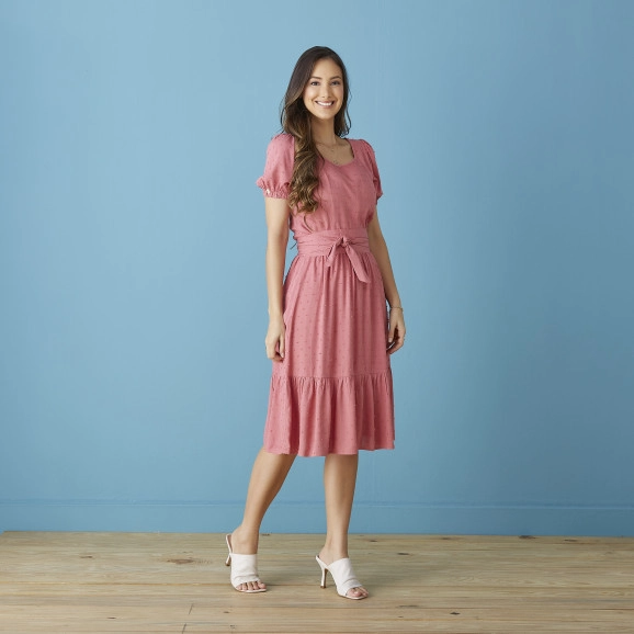 Vestido Pipoquinha com Faixa Rosa Tatá Martello confeccionado em Viscose "pipoquinha", forrado, decote em "U", manga curta "fofa", lastex na costa, saia com babado em evasê. Acompanha faixa de mesmo tecido. Composição: 100% Viscose