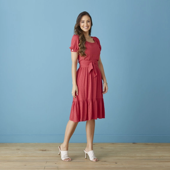 Vestido Pipoquinha com Faixa Vermelho Tatá Martello confeccionado em Viscose "pipoquinha", forrado, decote em "U", manga curta "fofa", lastex na costa, saia com babado em evasê. Acompanha faixa de mesmo tecido. Composição: 100% Viscose