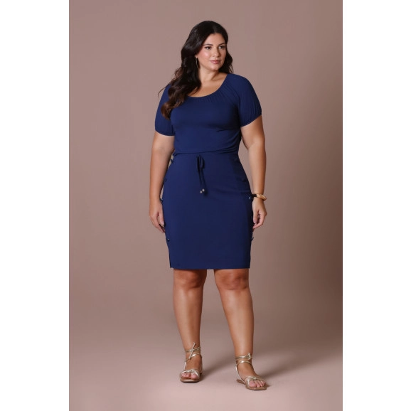 Vestido Plus Size Com Botões Encapados De Malha Lisa Azul Marinho Hadaza